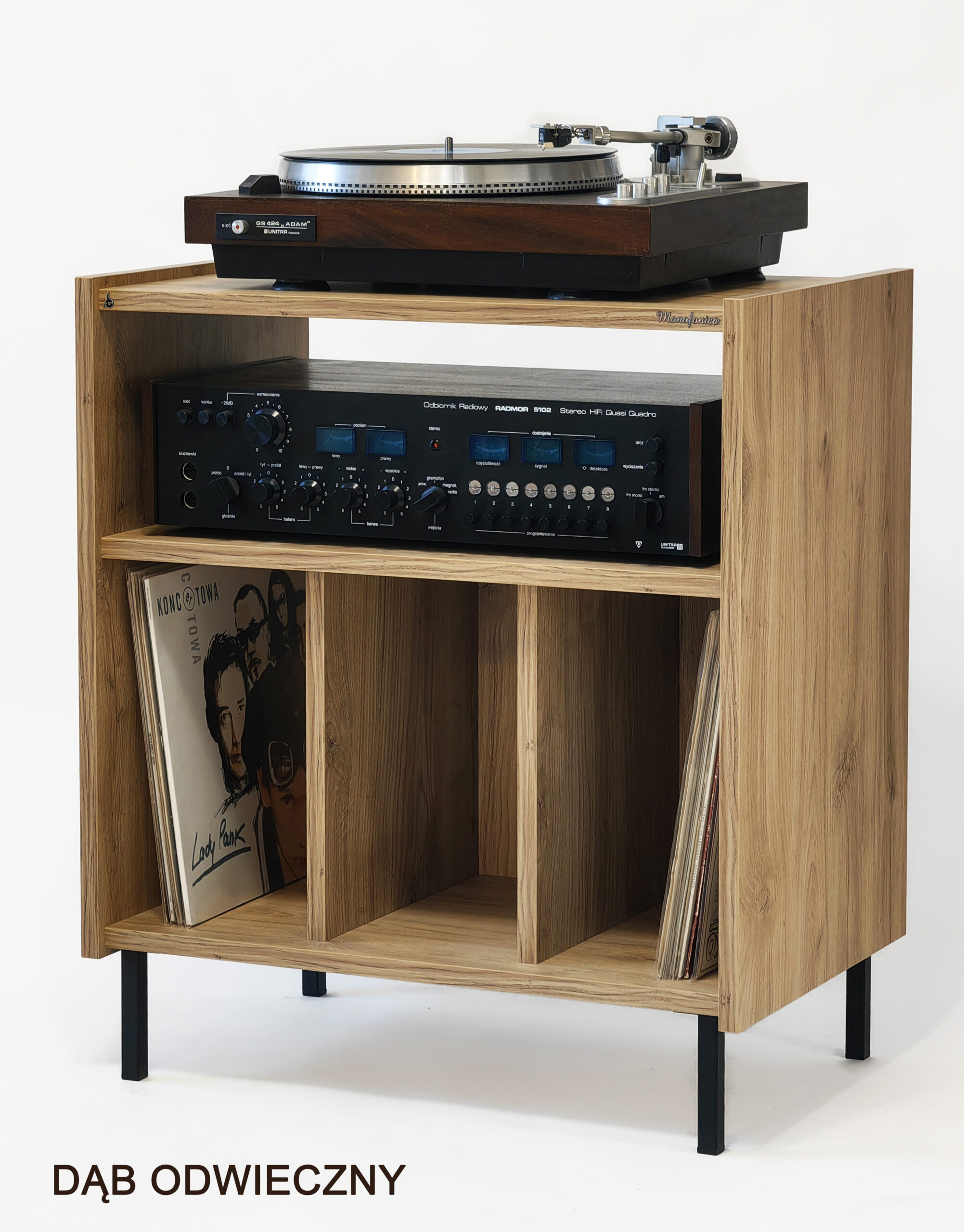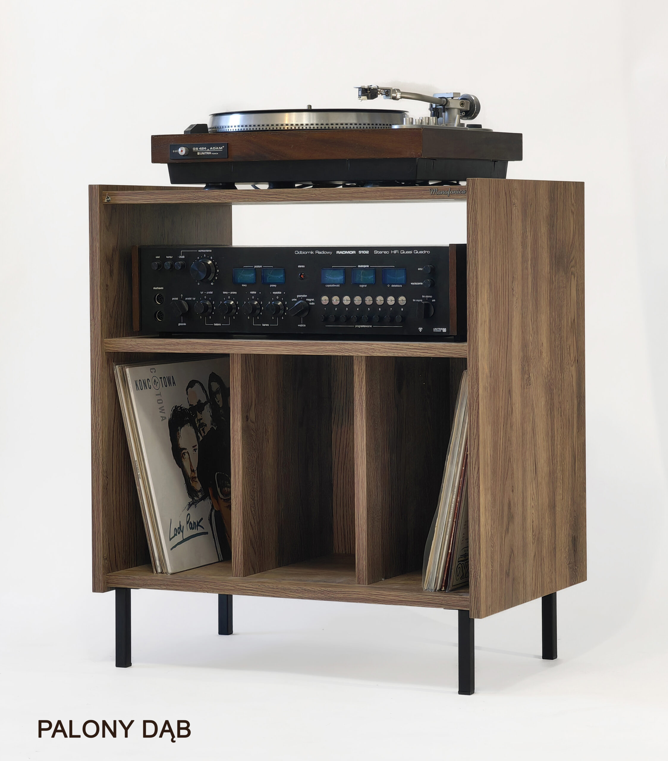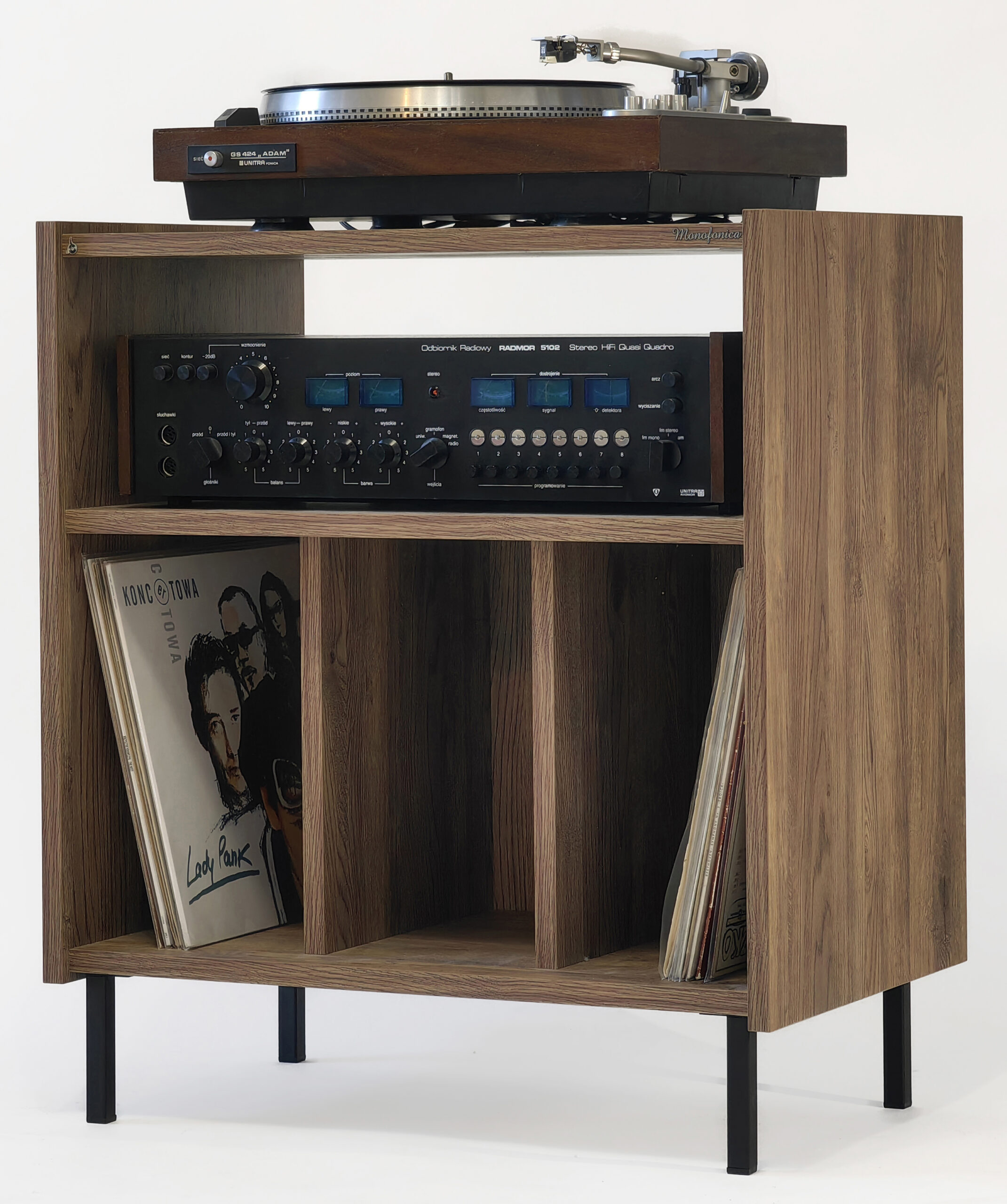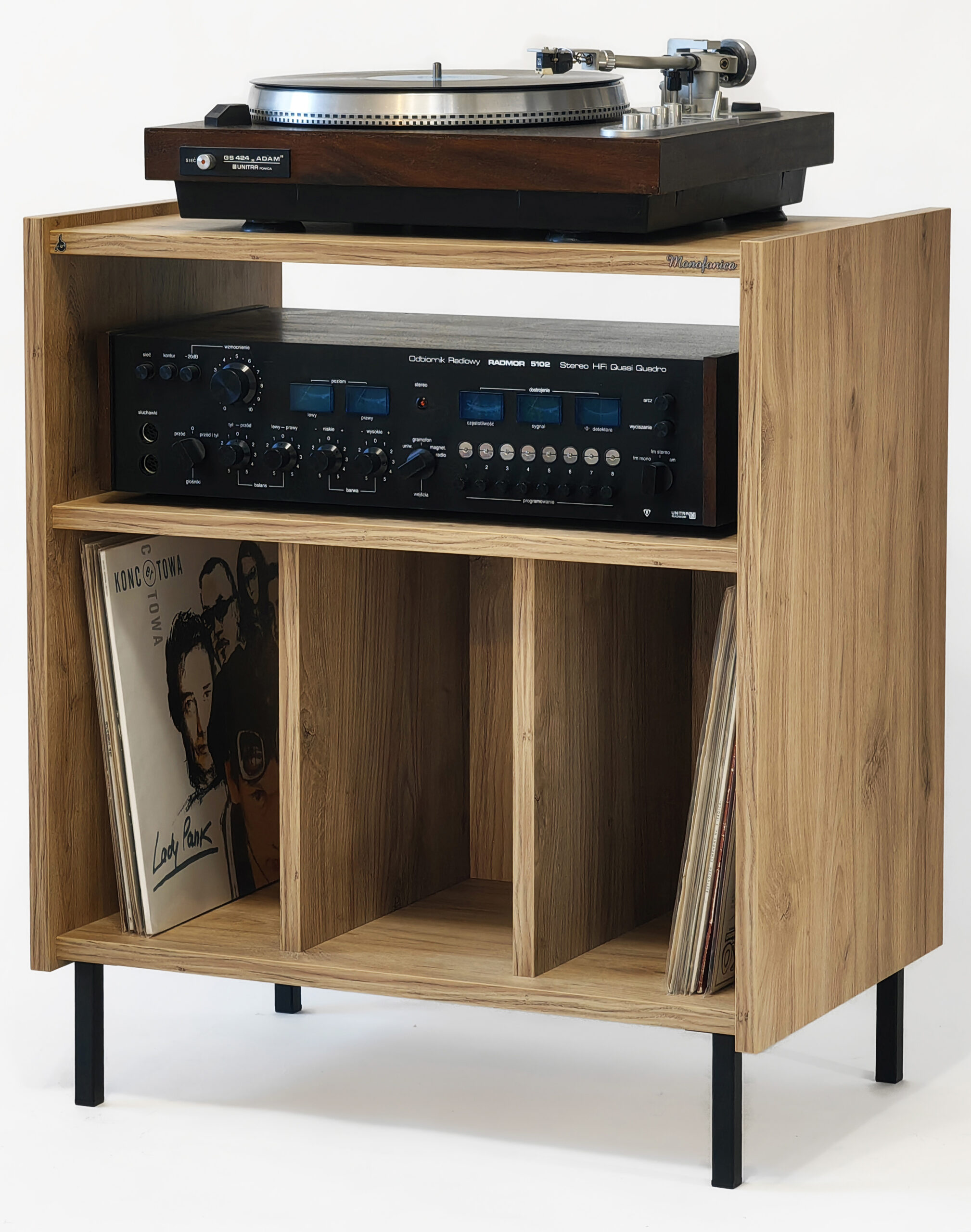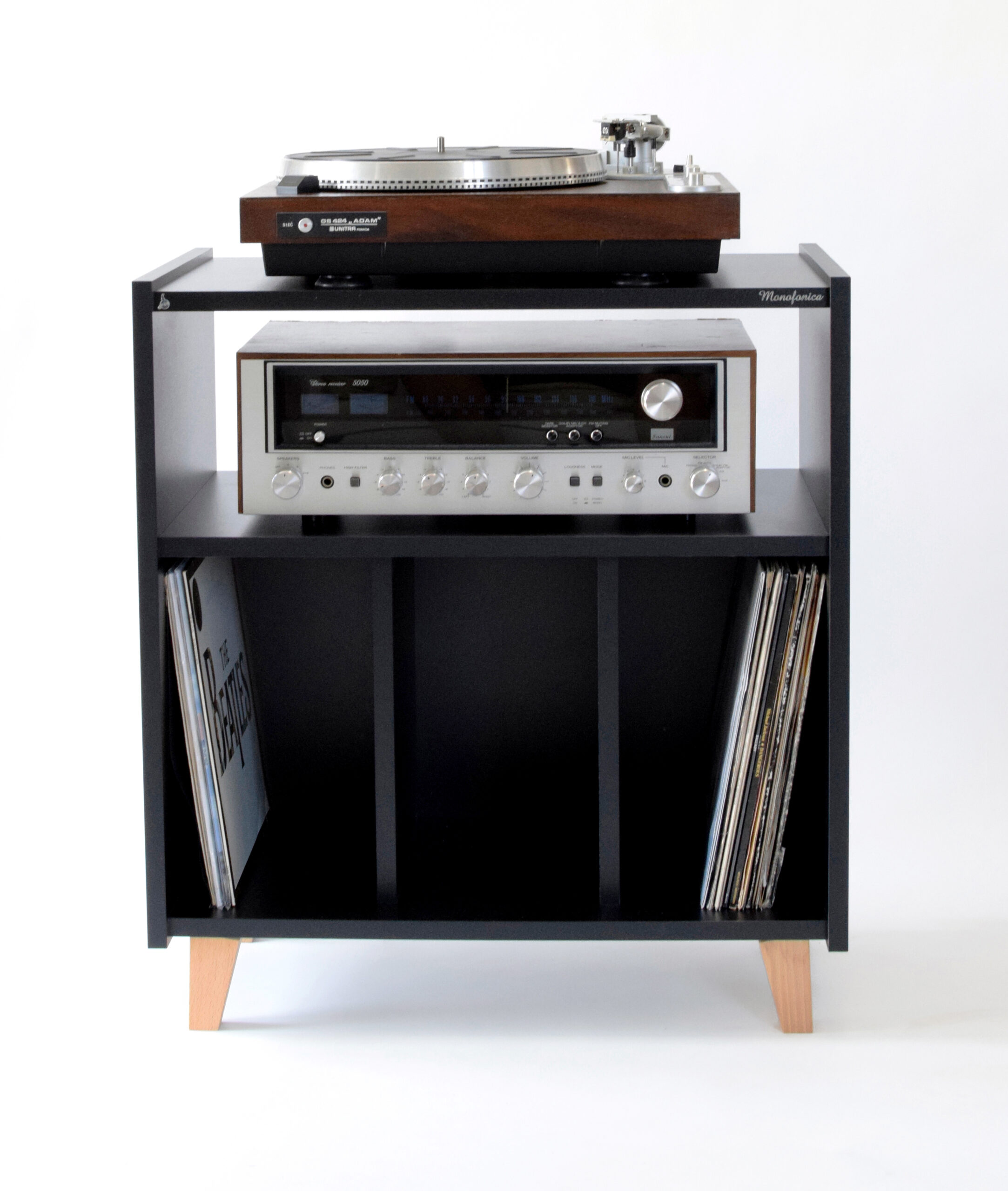 Szafka gramofonowa Monofonica NOVA z przeznaczeniem na gramofon, wzmacniacz i płyty.       Piękne wzornictwo i szeroka gama kolorów nawiązująca do lat 70 i 80 ubiegłego wieku.  Jakość i funkcjonalność potwierdzona zadowoleniem naszych klientów w kraju i za granicą.